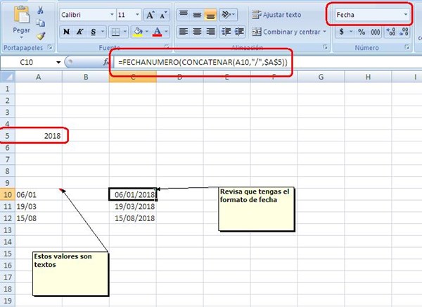 Por favor, tener en cuenta que el día y mes son valores fijos, lo que es variable es el valor de año que debe ser tomado de la celda "A5".