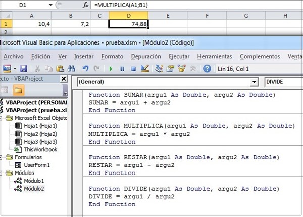 2. Función multiplica: esta debe recibir dos números y retornar la multiplicación de estos, la función debe quedar con el nombre de MULTIPLICA