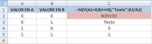 =SI(Y(A2=0;B2<>0);"Texto";B2/A2)