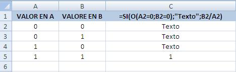 =SI(O(A2=0;B2=0);"Texto";B2/A2)
