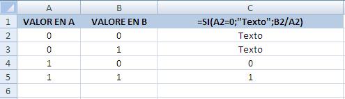 =SI(A2=0;"Texto";B2/A2)