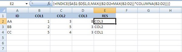 Y lo que busco es que en la columna "Resultado" me arroje el nombre de la columna en donde encontró el máximo valor. Es decir cuando el ID es AAA el resultado es la "Columna 3" por que el numero 8 es el valor máximo.