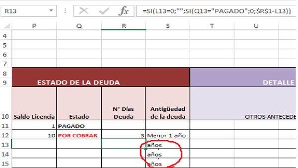 Resulta que tengo esta formula =SI(R11=0;" ";SI(R11<365;"Menor 1 año";SI(R11<1095;"Entre 1 y 3 años";SI(R11<1825;"Entre 3 y 5 años";SI(R11>1825;"Mayor a 5 años";))))) me gustaria saber cuando las celdas esten en blanco como para que no me aparecia mayor a 5 años porque la celda en blanco me la toma como un valor. Adjunto dibujo de con la zona achurada en "ROJO" donde esta el problema