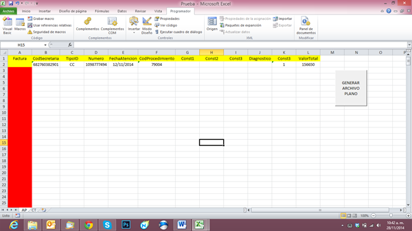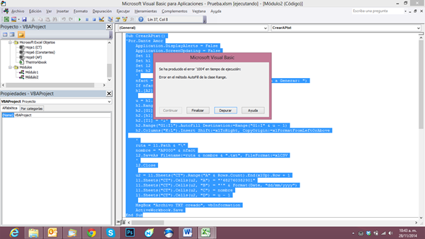 Sub CrearAPtxt() 'Por.Dante Amor Application.DisplayAlerts = False Application.ScreenUpdating = False Set l1 = ThisWorkbook Set h1 = l1.Sheets("AP") Set l2 = Workbooks.Add Set h2 = l2.ActiveSheet ' nfact = InputBox("Favor introducir el numero de Factura a Generar: ") If nfact = "" Then Exit Sub h1.[A2] = nfact u = h1.Range("B" & Rows.Count).End(xlUp).Row h1.Range("A2:L" & u).Copy h2.Range("A1") h2.[G1] = "2" h2.[h1] = "2" h2.[I1] = "1" h2.Range("G1:I1").AutoFill Destination:=Range("G1:I" & u - 1) h2.Columns("K:L").Insert Shift:=xlToRight, CopyOrigin:=xlFormatFromLeftOrAbove ' ruta = l1.Path & "\" nombre = "AP000" & nfact l2.SaveAs Filename:=ruta & nombre & ".txt", FileFormat:=xlCSV ' l2.Close u2 = l1.Sheets("CT").Range("A" & Rows.Count).End(xlUp).Row + 1 l1.Sheets("CT").Cells(u2, "A") = "'682760382901" l1.Sheets("CT").Cells(u2, "B") = "'" & Format(Date, "dd/mm/yyyy") l1.Sheets("CT").Cells(u2, "C") = nombre l1.Sheets("CT").Cells(u2, "D") = u - 1 MsgBox "Archivo TXT creado", vbInformation ActiveWorkbook.Save End Sub