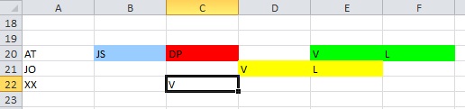 Si en el rango ("B19:AR367") se escribe una de estas iniciales: "V", "L", "S", "AP", "FJ", "VP"