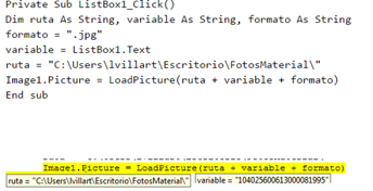 Una vez que listbox esta cargado con la información y selecciono cualquier fila de listbox deseo que me muestre la foto según la selección... Pero cuando ejecuto sale el msg no ha encontrado ruta de acceso... Las variables lo declare como string.