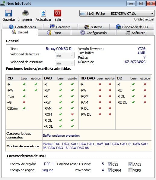 De acuerdo al nero info tools (adjunto imagen) me dice que no lee ni escribe DVD HD, pero en el manual de la laptop dice que la lectora blu-ray, tambien lee y quema DVD DL (double layer).