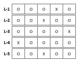 Según la imagen anterior. Tenemos 5 líneas horizontales L-1, L-2, L-3, L-4, L-5 estas tienen 5 casillas cada una con 1 (X) y 4 (O). Suponiendo que cada casilla de estas están ocultas y que debemos descubrir solo una de cada línea. Ósea descubriremos 5 casillas, una de cada línea.