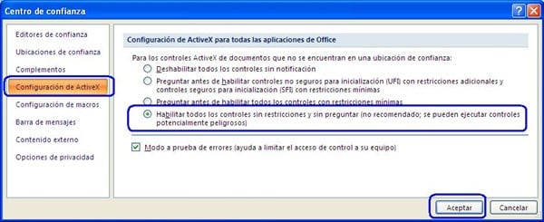 En varios libros de Excel 2010 tengo incrustados varios CommandButtons con su código correspondiente. Antes de ayer, y como por arte de mágia, estos controles dejaron de funcionar. No he cambiado nada de la configuración de Excel, ni de la propia programación de los CommandButtons. Simplemente no me permiten clickar en ellos. Cuando accedo al Programador e intento incrutar otro control ActiveX me lanza el mensaje de "No se puede insertar el objeto".