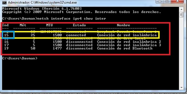 Como puedes ver en la imagen en mi laptop tengo todas esas conexiones (cuadro rojo), pero solo nos interesa a conexión por la cual nos conectamos a internet en mi caso wifi (cuadro amarillo), EL DATO que necesitamos para el siguiente paso es identificador de red (cuadro celeste). Con ese dato, en ese mismo cmd pones lo siguiente: