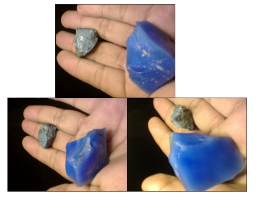 Alguien me podría decir de que tipo de piedra se trata esto, una la encontré en la cordillera a 3000 metros de altura aproximadamente removiendo piedras la azul y la más chica la encontré en un arroyo a media cordillera. Siempre busco piedras pero estas no la he visto.la azul es muy parecido como cuando partes una vela esta quedo así por que es un pedazo de una más grande que la compartí y la más chica esta como fundida da la impresión.