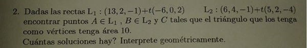 $$\begin{align}&A=(1,2,3)+t(-6,0,2)\\&\\&B=(1,2,3)+\frac{10}{t \sqrt{239}}(5,2,-4)\\&\\&\forall \;t \in \mathbb{R}-\{0\}\end{align}$$Si el profesor es de los que no puede ver una raíz en el denominador lo racionalizas.