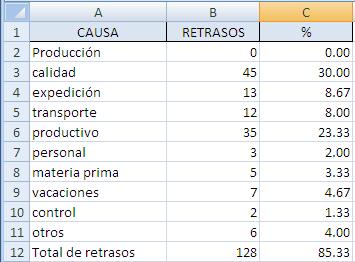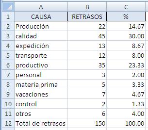 (Teniendo el dato de la frecuencia absoluta(22,45,...) en una hoja de excel he calculado para cada causa la frecuencia relativa en% y la frecuencia relativa acumulada y he realizado el diagrama de Pareto pero no consigo contestar a la siguiente pregunta: