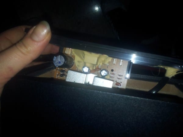 Estoy intentando reparar unos altavoces Logitech que tienen el cable del subwoofer y alimentación roto, pero también la entrada del mismo, al parecer. El problema es que hasta ahora sólo había abierto ordenadores, móviles, discman, cadenas de música o cosas así, y al abrir el altavoz me encontrado con una cosa que nunca había visto antes y que no sé cómo la puedo quitar y luego sustituir. Se trata de una pasta blanca, dura, que está en todo el alrededor de la conexión de entrada (hembra) y como envolviéndolo en su agarre a la placa.