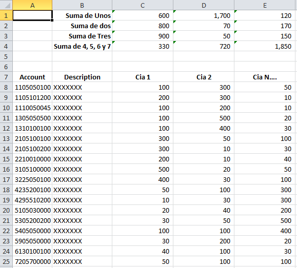 Hola expertos de acuerdo a esta Gráfica, necesito de una macro que sume las columnas C, DE y E y todas las columnas que estén a la derecha a partir de la fila 8 hasta el ultimo dato, la suma debe ser por el primer dígito de las cadenas de números de la columna a, y colocar el resultado de las sumas desde c1 a c4, de d1 a d4, de e1 a e4, y así hasta donde hayan columnas con datos.