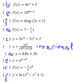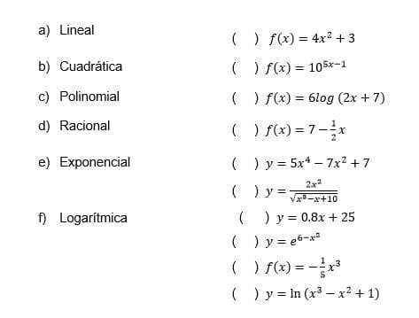 - Relaciona la columna de la izquierda con la de la derecha, escribiendo la letra que identifique a la expresión el tipo de función que le corresponda.