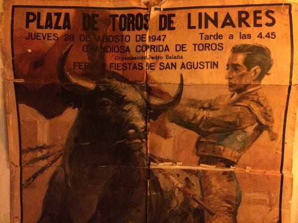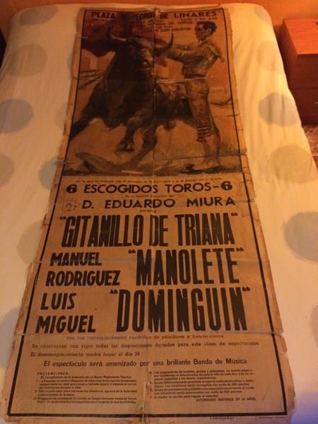 Me pongo en contacto con ustedes, ya que tengo un cartel de 1947 de la última corrida de Manolete en Linares que tenía guardado mi abuelo. El cartel mide 1,80 x 80cm aproximadamente. Está un poco desgastado por los años que tiene y no haber estado enmarcado, pero está entero.