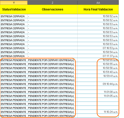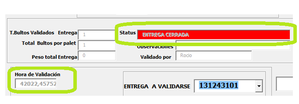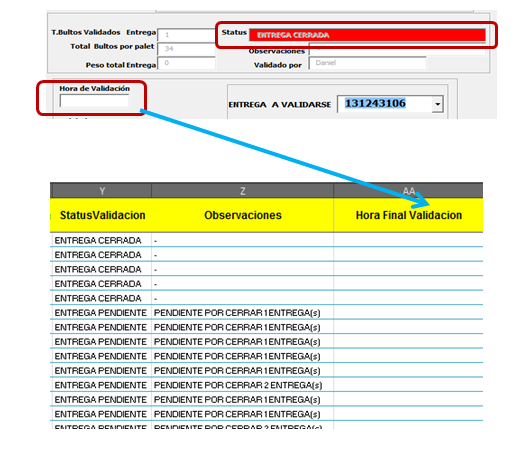 Tengo en la macro la caja de texto Hora de validación en la cual se coloca la hora cuando el Status de la entrega se encuentre Cerrada.