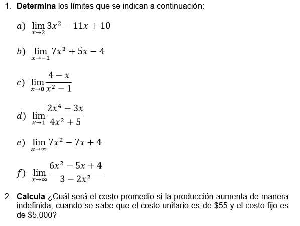 $$\begin{align}&\lim_{x\to\infty} 7x^2-7x+4=\\&\\&\lim_{x\to\infty} 7x(x-7)+4=\\&\\&7·\infty(\infty-7)+4 =\\&\\&7·\infty·\infty+4=\\&\\&7·\infty+4=\\&\\&\infty+4 = \infty\\&\end{align}$$f) Y en este aplicaré directamente las conclusiones de un ejercicio anterior donde se decía que si el grado del numerador y el denominadoir es el mismo, el límite es el cociente de los coeficientes de los términos con mayor grado. Si quieres hacerlo de la forma teórica ortodoxa hazlo de la misma forma que lo hice en ese ejercicio