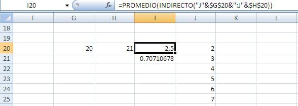 Necesito vuestra ayuda para ver si puedo hacer lo siguiente. Por ejemplo, tengo hecho el promedio en unas celdas aleatorias (ej: =PROMEDIO(J20;J25)) y quiero también hacer la desviación (ej: =DESVEST(J20;J25)) y así para más funciones que necesite. Pero quiero hacerlo de tal forma que, si yo hago un cambio en las celdas del promedio, (ej: =PROMEDIO(J20;J21)) también me haga el cambio automáticamente en la desviación, etc. ¿Hay alguna forma de hacerlo?