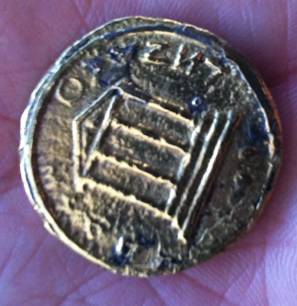 Tengo una moneda antigua cuyo origen parece griego o romano. El material parece ser Electro. Tiene mucho desgaste, puesto que se encontraba incrustada en un recipiente de latón , cobre ...no lo se.
