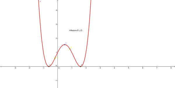 Puntos de inflexión no hay porque ya se dedujo que los puntos quie anulaban la derivada primera eran dos mínimos y un máximo.