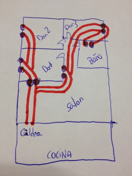 Los puntos que te pongo en cada pared es un radiador, y tiene entrada de agua por arriba y salida por abajo y lado opuesto, el resto va por el suelo empotrado excepto el tramo que sube del radiador por la pared y lo que hace es ir con "T" igual me explico mal pero no entiendo porque no funcionaria es un sistema de calefacción bitubo con dos ramales ¿? Es que es muy difícil de explicar pero sale de la cocina de la caldera baja por la pared, se mete en el suelo se coloca una T y suber por la pared para poner un radiador, ¿de ahí de esa T pasa a otro y lo mismo y así sucesivamente un ramal con tres radiadores y otro con otros tres?