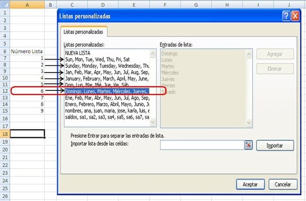 1. Después de crear tu lista personalizada, identifica el número de lista, por ejemplo, voy a trabajar con la lista personalizada "Domingo, Lunes, Martes, Miércoles, Jueves...", esta lista personalizada le toca el número consecutivo 6, como se puede apreciar en la siguiente imagen:
