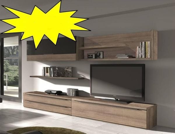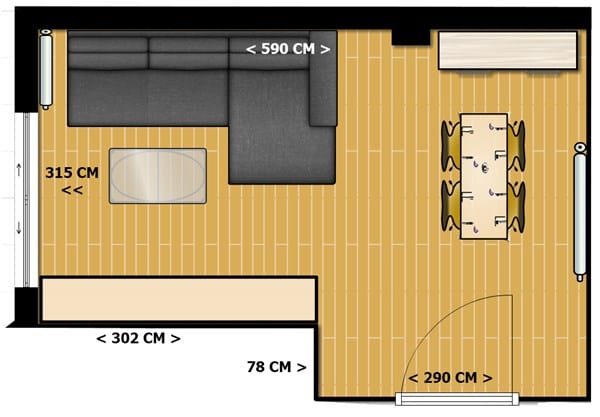 Os adjunto un plano del comedor, foto del mueble TV que he escogido (roble aserrado 300cm), el resto de muebles también en roble aserrado. Sofá gris oscuro casi negro.