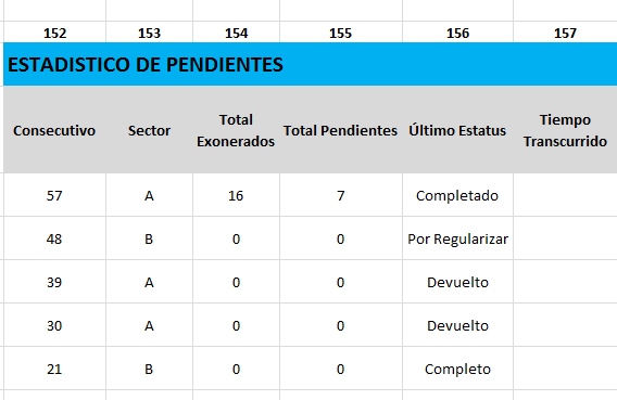 Las columnas de la 154 a la 157 tienen la fórmula buscar para que el dato se actualice siempre.