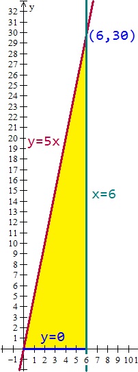 A) Calcula por integración el área del triángulo limitado por la recta y = 5x, el eje de las “x” y la ordenada x = 6. Comprueba el resultado determinando el área con la fórmula que se utiliza A = (b * h) / 2. No olvides que para plantear éste problema debes realizar la gráfica de la función en el intervalo mencionado.