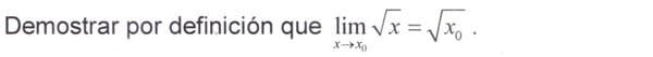 $$\begin{align}&|\sqrt x -\sqrt {x_o}|=\\&\\&\left|\frac{(\sqrt x-\sqrt{x_0})(\sqrt x +\sqrt{x_0})}{\sqrt x + \sqrt{x_o}}\right|=\\&\\&\left|\frac{x-x_0}{\sqrt x + \sqrt{x_o}}\right|=\\&\\&\frac{|x-x_0|}{\sqrt x+\sqrt {x_0}}\le \frac{|x-x_0|}{\sqrt {x_0}}\\&\\&\text{tomaremos }\;\delta=\epsilon· \sqrt{x_0}\;\; \text { con lo cual}\\&\text{para los x tal que }0\lt|x-x_0|\lt \delta\\&\\&|\sqrt x- \sqrt{x_0}|\le \frac{|x-x_0|}{\sqrt{x_0}}\lt \frac{\delta}{\sqrt {x_0}}=\\&\\&\frac{\epsilon· \sqrt{x_0}}{\sqrt{x_0}}=\epsilon\\&\\&\text{resumiendo}\\&\\&|\sqrt x- \sqrt{x_0}|\lt\epsilon\end{align}$$Luego la raíz de xo es el límite de la función raíz de x cuando x tiende a xo.
