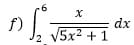 $$\begin{align}&\int_2^6 \frac{x}{\sqrt{5x^2+1}}dx =\\&\\&t=5x^2+1\\&dt = 10x\, dx \implies x\,dx=\frac 1{10}dt\\&x=2\implies t=5·2^2+1 = 21\\&x=6 \implies t=5·6^2+1 =181\\&\\&\frac 1{10}\int_{21}^{181} \frac{dt}{\sqrt t}=\frac 1{10}\int_{21}^{181}t^{-\frac 12}dt=\\&\\&\left.\frac{1}{10}\frac{t^{\frac 12}}{\frac 12}\right|_{21}^{181}=\left.\frac{\sqrt t}{5}\right|_{21}^{181}=\\&\\&\frac{\sqrt{181}-\sqrt{21}}{5}\approx\\&\\&\text{Dado que no son matemáticas puras lo calculamos}\\&\\&\approx1.77420967\\&\end{align}$$