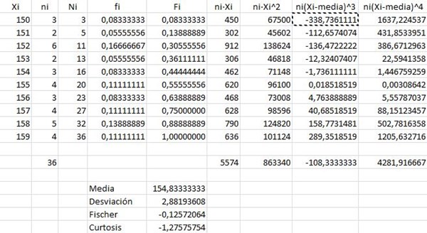 Bueno, ya tenemos la fórmula en la que se usa la suma de los cubos de los datos y datos calculados antes como la media y la desviación. Ha quedado uno poco complicada, luego si prefieres usa la original, al fin y al cabo si lo haces con Excel no le va a costar mucho más.