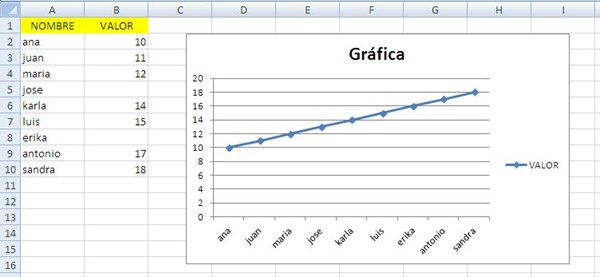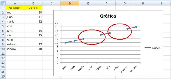 Tengo varios valores en una gráfica de excel y quiero unirlos con una línea el problema es que hay celdas intermedias que no tienen valores y no se como unirlos sin tener que rellenar esas celdas.