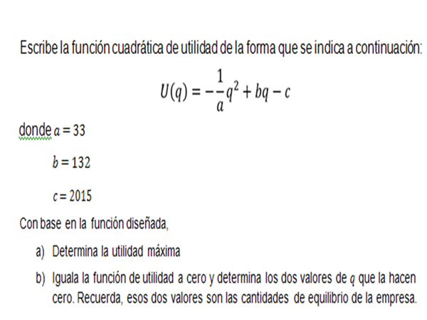- Iguala la función de utilidad a cero y determina los dos valores de? Que la hacen cero. Recuerda, esos dos valores son las cantidades de equilibrio de la empresa.