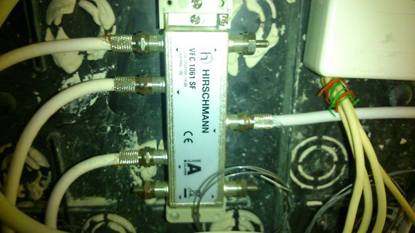 Por lo que veo todo esta bien conectado. Los dos cables que salen del mismo tubo son los que traen señal. Uno esta conectado a la entrada del repartidor y el otro esta como reserva sin conectar, el resto son las salidas a cada toma de la casa. En teoría ambos cables deberían llevar la misma señal, pero en ocasiones los instaladores llevan la señal solo por uno de ellos y el otro no lleva nada. Prueba a desconectar el cable de entrada y conecta el reserva en su lugar, las piezas conectadas en la punta veras que van a rosca, quita el empalmador y ya está.