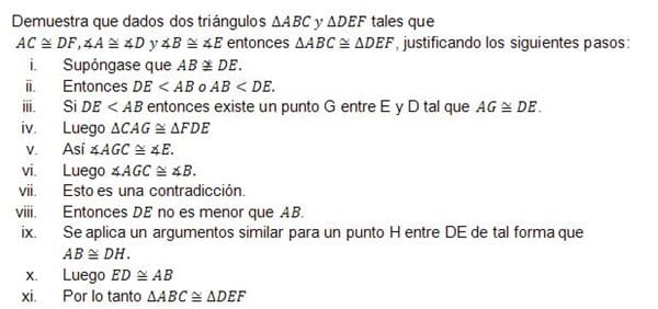 Y en el punto vii) dice que eso es contradictorio. Algún motivo habrá pero yo no sé qué axiomas estáis empleando. Debe ser algo de que dada una recta y un punto externo todos los puntos de la recta forman ángulos distintos con ese punto.