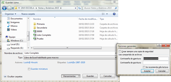 Tengo un archivo de Excel que le puse códigos A LAS MACROS, contraseña DE APERTURA y contraseñas a las HOJAS DE CÁLCULO hasta ahí todo bien; ahora el problema es cuando entro al archivo con la contraseña actual y le doy GUARDAR COMO: