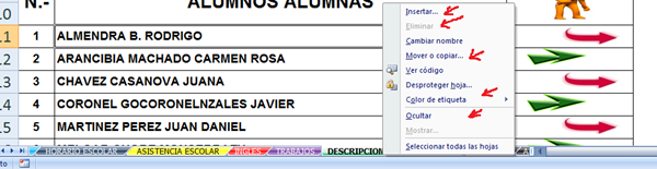 Deshabilitar estas opciones: Insertar, Mover o copiar, Ocultar, Eliminar, Color de etiqueta.