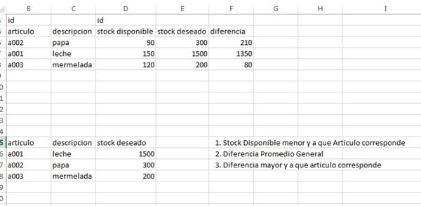 Necesito resolver las tres consignas que están en la imagen insertada, cona la función buscar v si fuera posible .ejemplo para encontrar el mínimo valor del stock disponible y que me figure al hacer esto también el articulo que corresponde.. Desde ya muchas gracias !