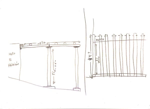 Parece una pregunta un poco general, pero os comento el tema. Nuestro terreno está en desnivel y queremos ampliar la zona que más usamos de patio. Para ello queremos hacer una estructura de terraza. Como podéis más o menos ver en el dibujo, constaría de dos pilares que la sustentarían, iría con una placa en un muro de hormigón y en el otro lado las viguetas apoyarían en lo que es el patio actualmente, mediante zunchos en el suelo y hormigonado. En fin, la cuestión es que sabemos soldar, mi abuelo era herrero y nos manejamos. Pero necesitamos ayuda porque no tengo la confianza para como aventurarme yo a elegir el tamaño de los pilares, las vigas y las viguetas. El peso que soportaría sería el de la misma estructura, las bovedillas, una capa de hormigón de unos centímetros y el suelo que le pongamos, más el trasiego de personas por encima.