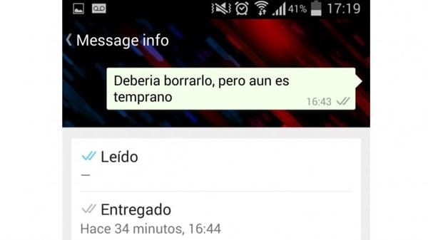 En Whatsapp, al hacer click en la información de un mensaje que yo he enviado, me aparece ''Entregado'' a determinada hora con doble tick gris, y ''Leído'' con una rayita - y doble tick azul . Significa que el mensaje no ha sido leído, no hay una hora determinada, el mensaje no ha sido enviado, ha quitado el doble tick azul, o simplemente no quiere contestar? Me pueden decir qué puede ser? Está igual hace 2 días. Algo parecido a esto, miren: