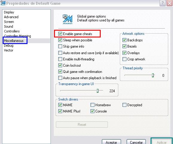 Lo siguiente es activar la función "Cheat" dentro del propio emulador, para ello nos dirigiremos a la pestaña del emulador "Options", luego entramos en "Default Game Options", y por último accedemos a "Miscellaneous", donde activaremos la casilla "Enable game cheats", para finalizar este proceso pulsamos en el recuadro "Aplicar".