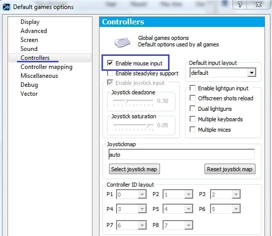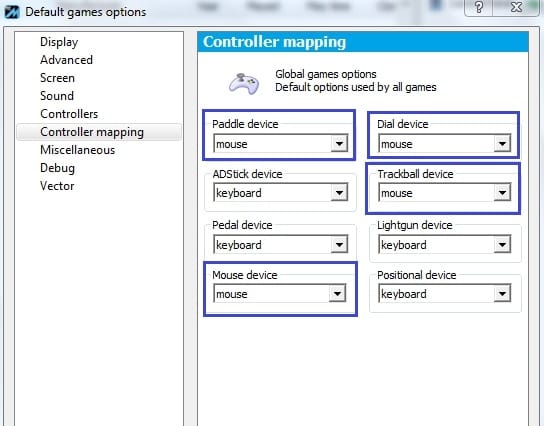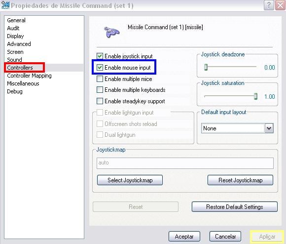 Por fortuna, Mame ofrece la posibilidad opcional de habilitar el ratón de nuestro equipo para que realice la función del trackball. Configurarlo es tan sencillo como entrar de nuevo en la pestaña de opciones generales (Options >> Default game options >> Controllers >> Enable Mouse Input). Por último pulsamos en "Aplicar"