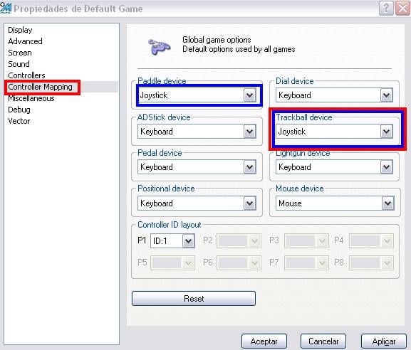 Para intentar jugar con los dos controlaes analógicos (o uno sólo), de tu gamepad Thrust, intenta dirigirte a "Controller Mapping" (desde la misma ventana anterior), y ajusta la pestaña del apartado "Trackball Device" y "Paddle" en "Joystick". Pulsamos de nuevo "Aplicar", para salvar los nuevos ajustes.