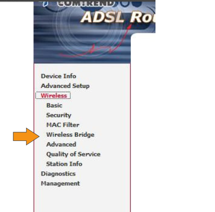 Ahora entramos en la configuración del Comtrend y vamos hasta la pestaña WIRELESS > WIRELESS BRIDGE