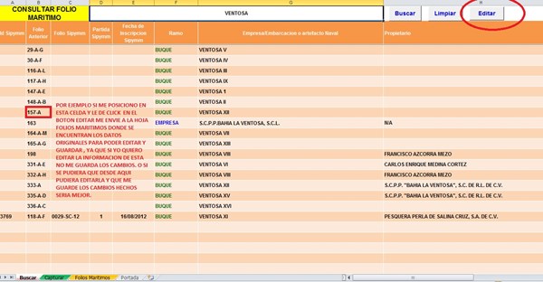 Tengo un libro con 4 hojas en la primera hoja(Buscar) exactamente en la celda D1 yo escribo una palabra y le doy buscar y me muestra todas las filas que contiene esa palabra y esta información la extrae de la hoja 3(Folios Marítimos). Entonces cuando yo quiero corregir algún dato tengo que irme a la hoja 3(Folios Marítimos) y buscar esa celda que yo quiero modificar, lo que quiero es que la macro me haga lo siguiente cuando yo me posicione en una fila con los datos filtrados de la hoja1 (Buscar)tenga la opción de darle click en un botón de comando y me direccione exactamente en la fila origen donde se encuentra la información y ya no tener que buscarla una por una en todas las filas. Menciono que en la hoja 1(Buscar) ya tengo dos botones de comando uno es para Buscar y otro es para limpiar datos de la búsqueda entonces quiero agregarle otro botón de editar para que al seleccionar una fila y darle editar me mande a la hoja3(Folios Marítimos). A ver si me explique bien.