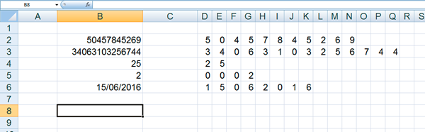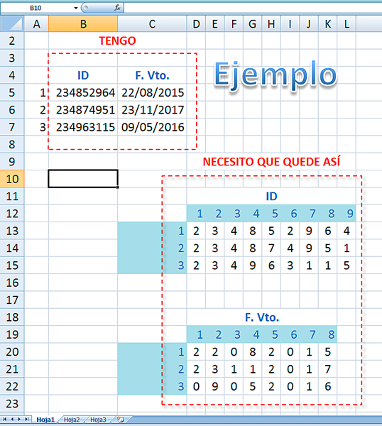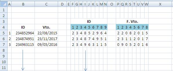 Necesito descomponer los 9 dígitos de ID y los 8 de la fecha en cifras individuales, en celdas individuales.