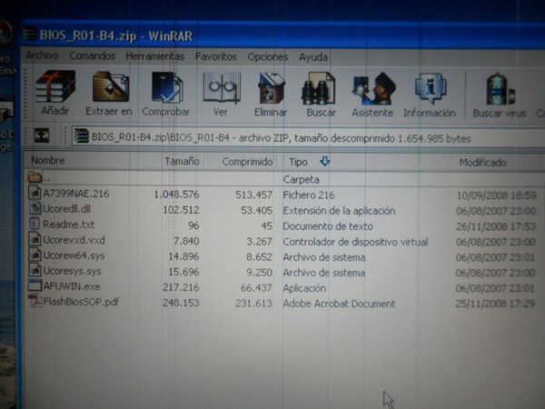 Aquí puedes ver el archivo .zip de la Bios descomprimido y solo hay un .exe que tiene toda la pinta de ser para windows (igual me equivoco )pero nada de .bat